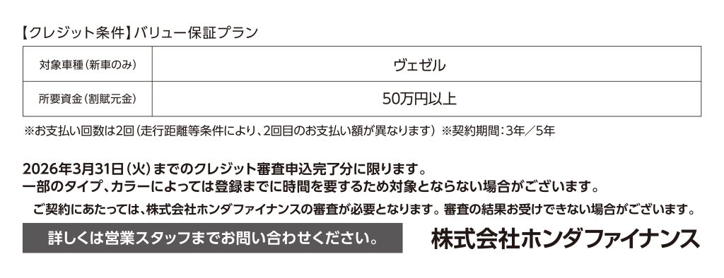 VEZEL バリュー保証プラン 1.9%キャンペーン実施中 2025.10.01 今ならVEZELがバリュー保証プラン 1.9%キャンペーン中でお求めやすくなってます。詳しくは店頭にてお問い合わせください。