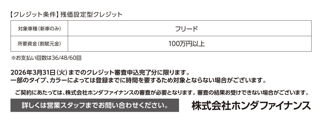 フリード 残価設定型クレジット 1.9%キャンペーン実施中 2025.12.26 今ならフリードが残価設定型クレジット 1.9%キャンペーン中でお求めやすくなってます。詳しくは店頭にてお問い合わせください。